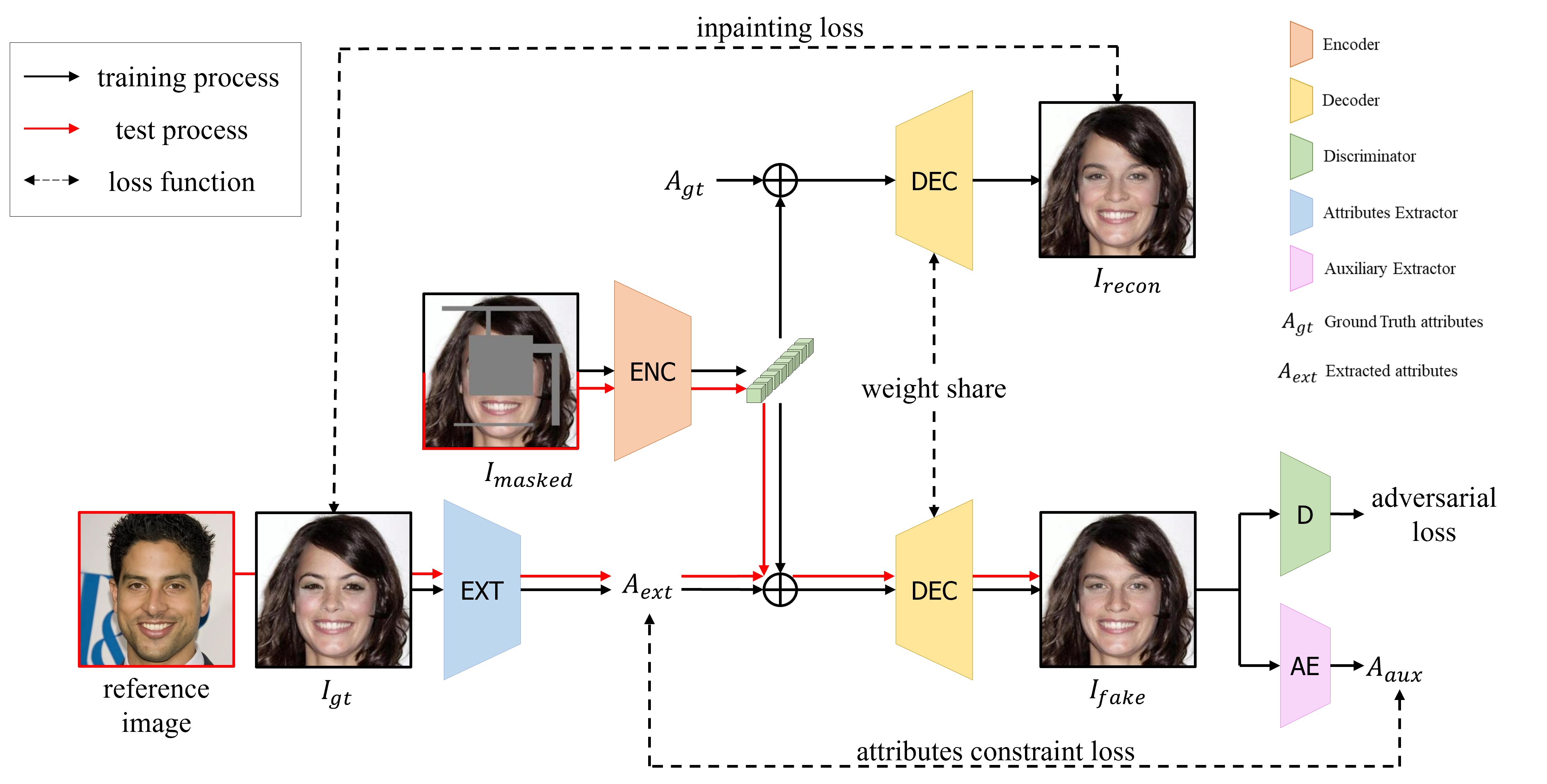 As shown in this figure, our architecture consists of four models: a generator, a discriminator, an attribute extractor, and an auxiliary extractor. Imasked and M are the input of G, we omit M in this figure to express clearly our framework. For the test stage(red line), the user extract desired attributes using our attributes extractor to a reference image.