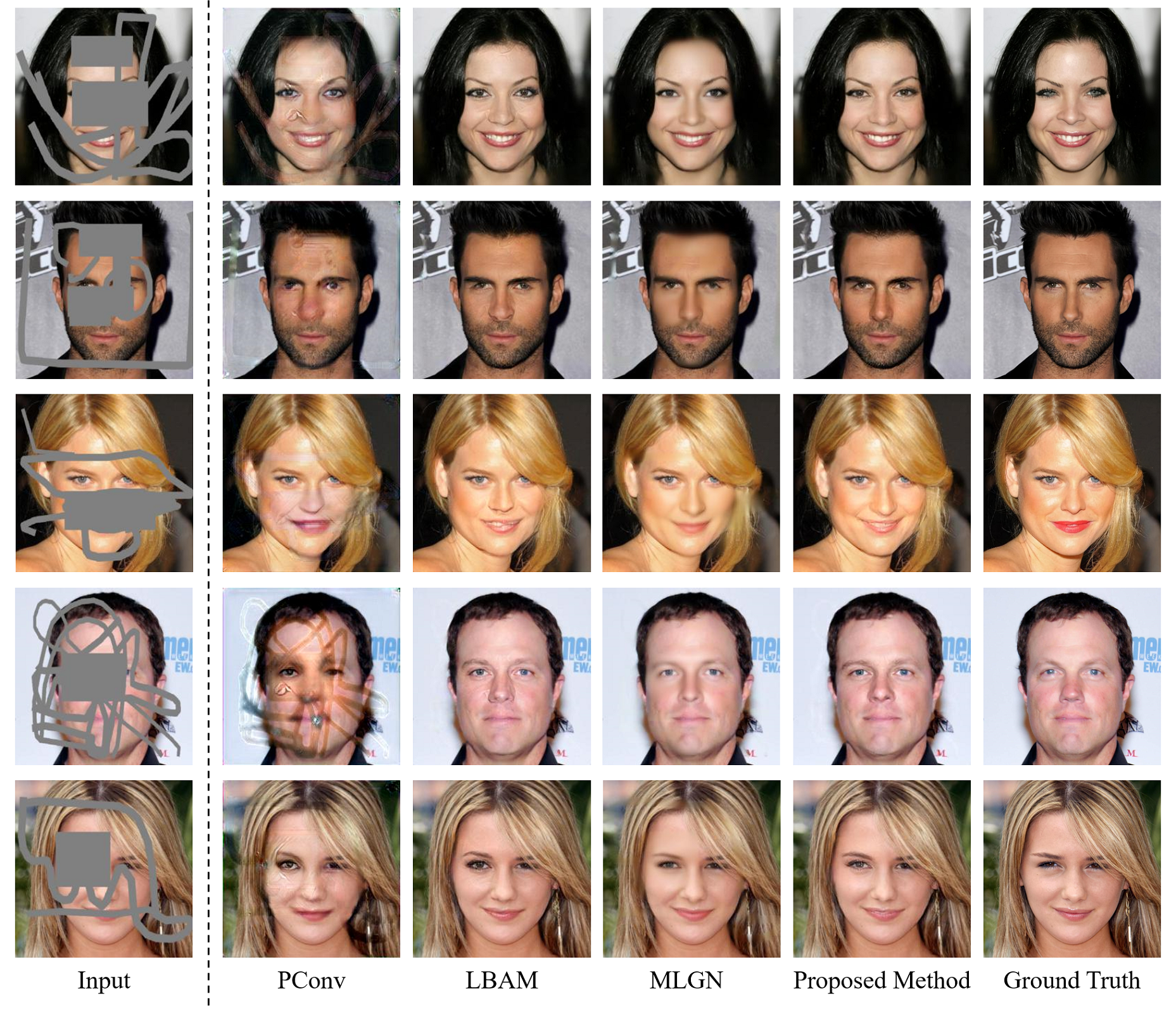 This figure shows images generated by the proposed method with those generated by the other methods. Our model performed better than all the others in terms of the generated image quality and plausibility. We adopt the ground truth attributes to only evaluate the quality of the image inpainting task of our model. In our approach, despite the large irregular holes, facial structures are well preserved.