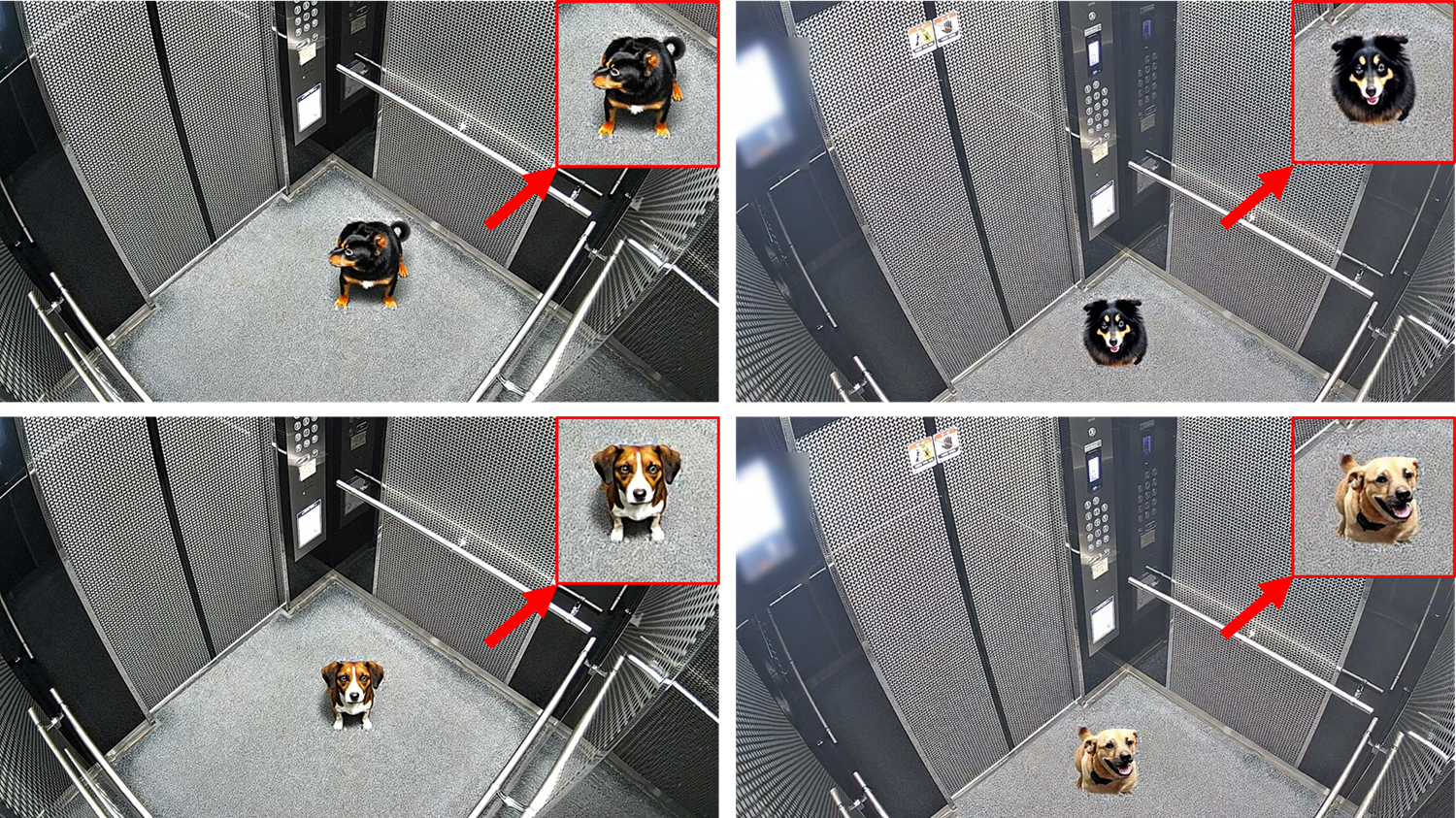 - Target object: the object to be synthesized within the given domain context. While these objects are typically common and could feasibly appear in domain images, we focus on natural object--scene combinations that are scarce in publicly available datasets (e.g., underground parking lot with a fire, elevator CCTV viewpoint with a dog, robot vacuum cleaners in home security footage).